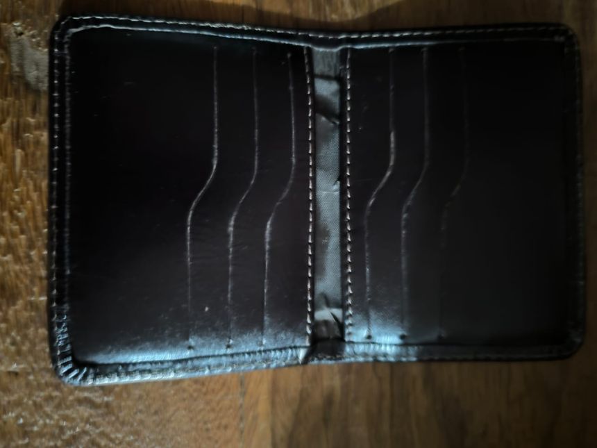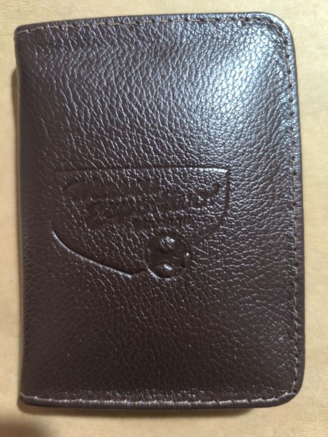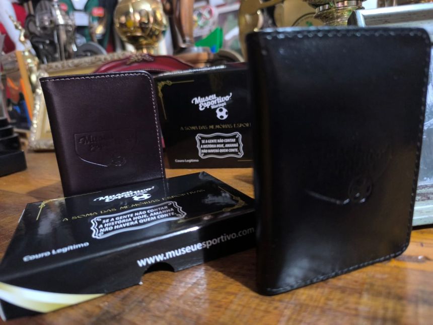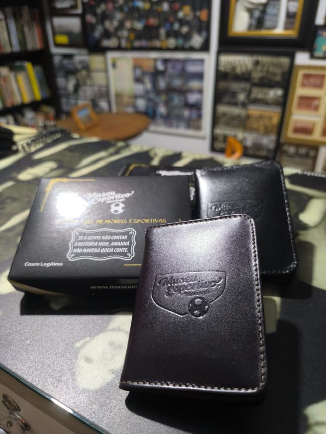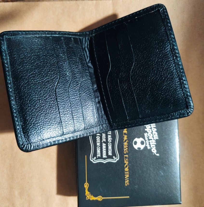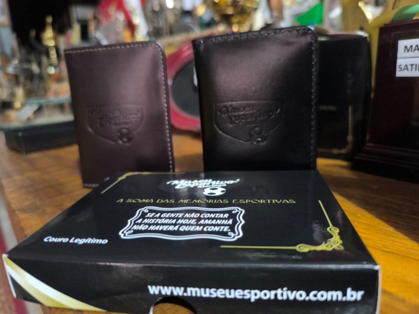 Um porta-cartões de couro legítimo, prático e estiloso, com a marca do Museu Esportivo de Maringá.